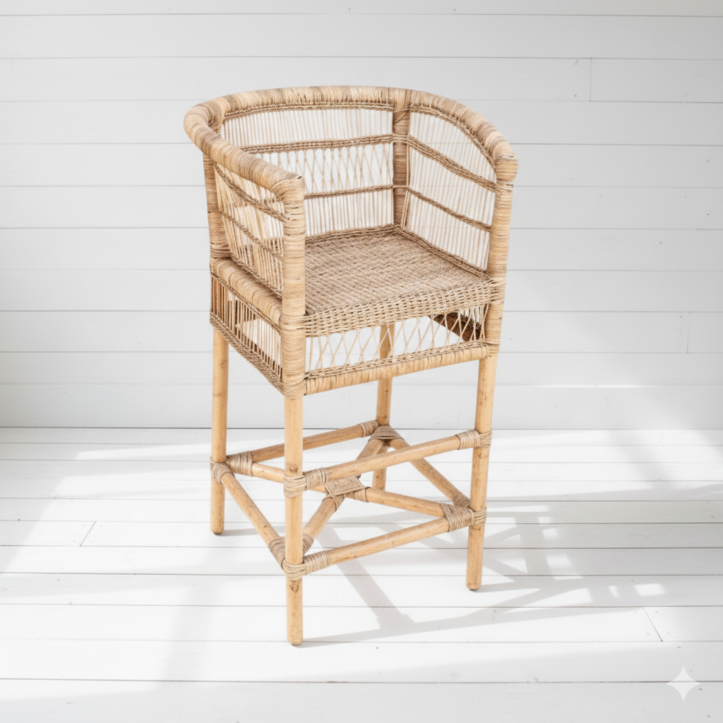 Traditional Bar Stool Malawi Chairs are handmade and boast a beautifully complex and intricate design of rattan strips ingeniously held together by unique knots instead of glue to create a one of a kind chair. Meticulously crafted with all-natural materials by our dedicated and talented craftsmen, each chair is carefully fumigated and pre-levelled to guarantee strong and sustainable furniture for you. The Bar Stool Malawi Chair features a striking design while effortlessly elevating the decor no matter where you choose to place it.